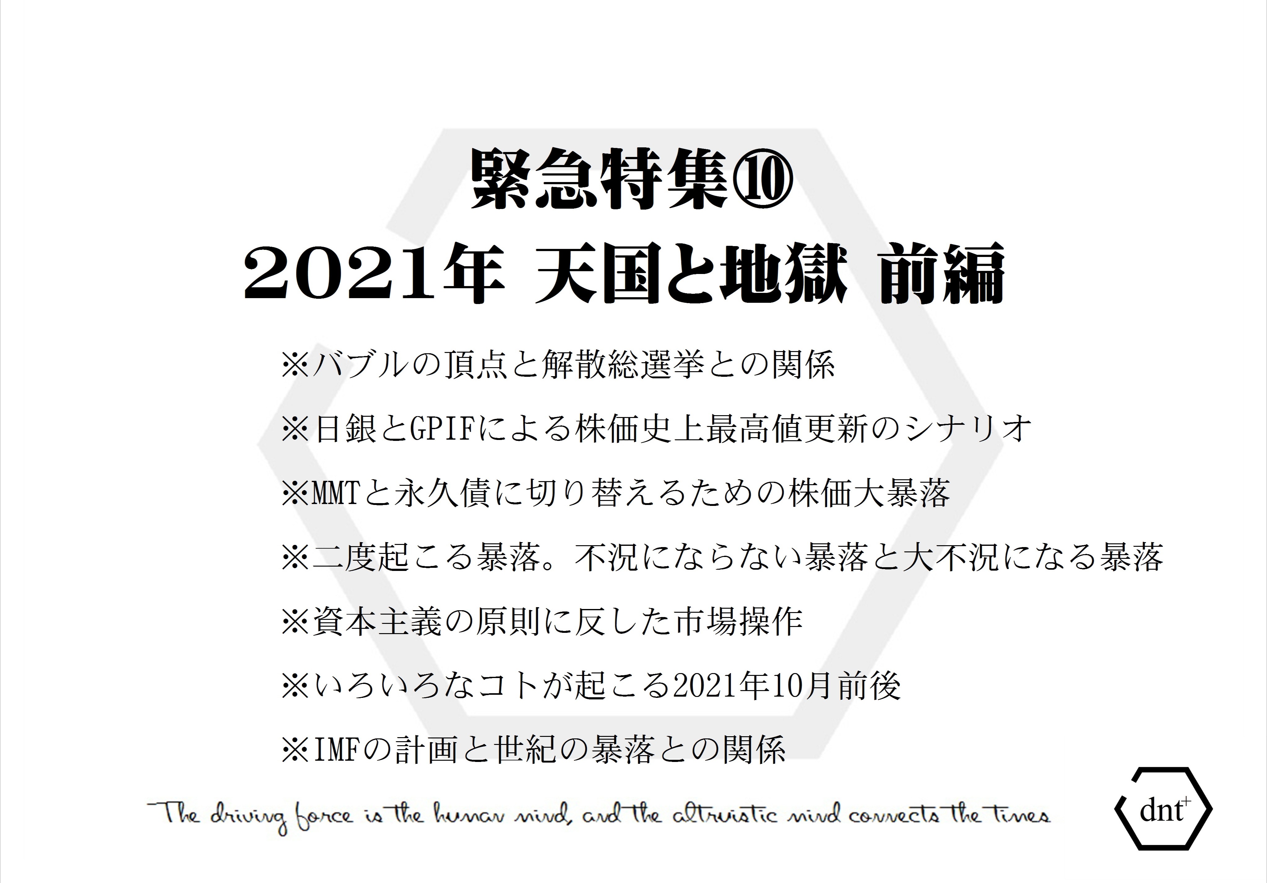 『経済は成長するが株価は下がる』←これが10月以降に起こる第一次循環型バブル崩壊だということです。その後に起こる、経験したことのない『21世紀型大暴落』は2021年ではありません…
