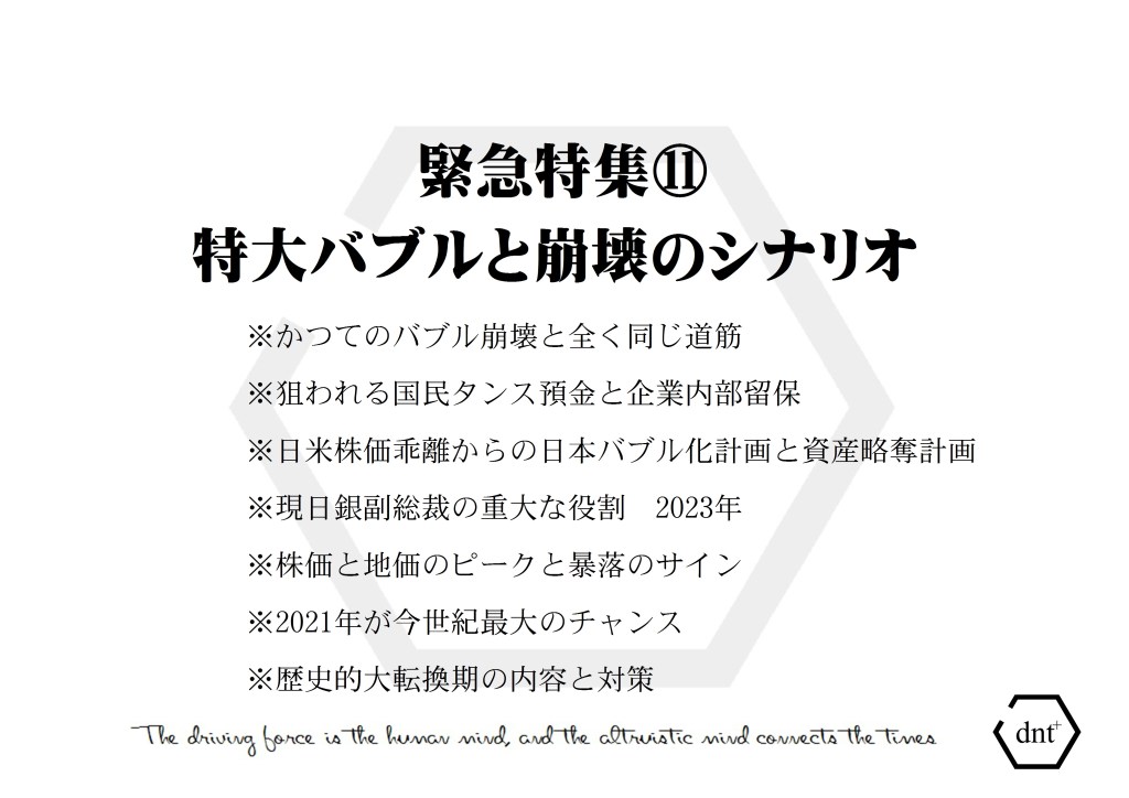 今はこの流れと同じように、FRBの意向に従ってヘッジファンドは日本をバブル化するために、まず日米株価の異常な乖離を見せつけると同時に、日本の株価を乱高下させながら底上げを続け、日本のギャンブルマネーを株式市場へ誘導しようとしています。最優先で狙っているのは、2020年末時点で101兆円になった日本国民の『タンス預金』。日銀はFRBの意向に従い、銀行は「確実に安全な大企業の株を買えば配当も入るし、これから先も値上がりする!タンスにしまっておいたら大損する!」とお年寄りに伝え、タンス預金を株式市場に引っ張り出そうとするでしょう。急速に進む大手の副業解禁やSBI証券がロビンフッドと同じようなシステムを導入したように、これからメディアでも投資熱を煽ってくるでしょう。