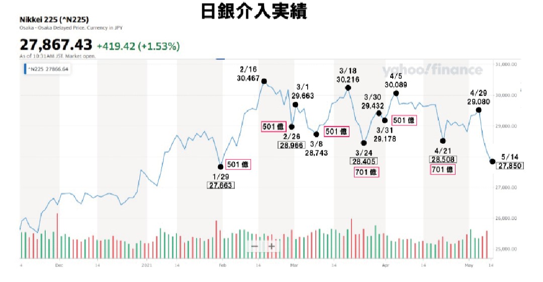 さらに、4月21日に28,508円まで下がると701億円の介入で、4月29日29,080円に戻しましたが、その後急落して昨日13日は27,300円台まで下げ、1月29日の27,663円より下げる結果に。日経平均が27,000円台から28,000円台へ下がると必ず日銀は介入し、途中で下がると追加介入で3万円台へ戻していることが分かります💡