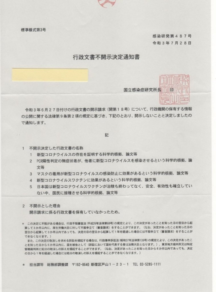 この行政文書から読み取れることは、コロナに関して報道されているワク●ンやマスク、PCR検査の有効性が証明できないことを意味します。さらに、感染者から無症状者に転移する可能性があること。ワク●ンの治験が終わっていないことを意味しています。