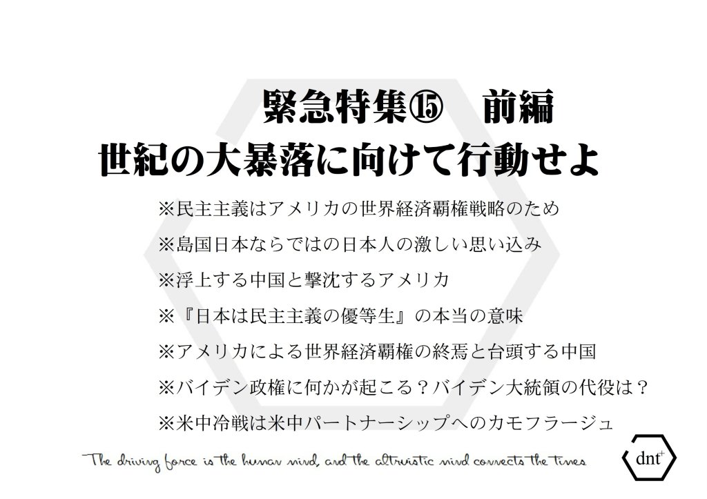 日本は島国で欧州等の陸続きの国々と違って隣国が見えないため、他国と比較ができません。だから日本人は思い込みが激しいと言われています。日本人はアメリカの都合で一旦洗脳されると、それが間違いであることが目に見える形ではっきり証明されたとしても、なかなか洗脳の罠から解放されない… よって、これから世紀の大暴落が起きる、金融システムが転換するとなっても実際に起こるまで気付かない…
