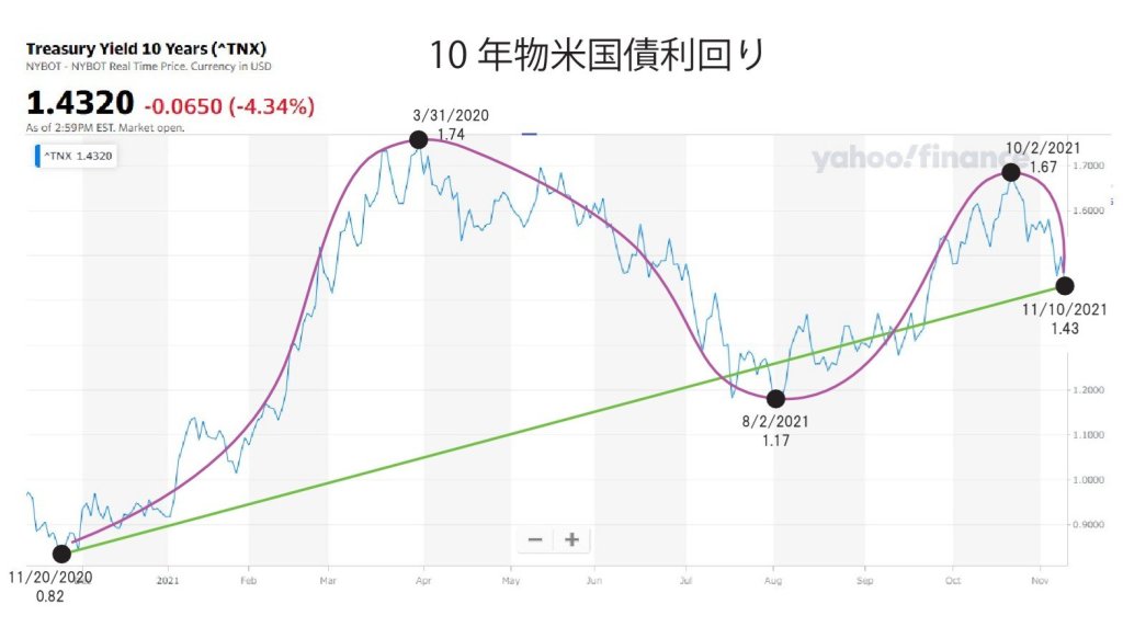 チャートを見ても分かるように、直近では米10年物利回りを下げてきていることによりインフレが落ち着いたという印象から株価が上がっていましたが、これは大きな間違いであり、上げ基調の中での下げであるということ。基本的には上げ基調です。