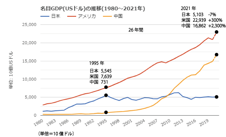 1995年から2021年までのGDPの伸びを見ると、中国2,300%、米国300%、日本はマイナス7%📉