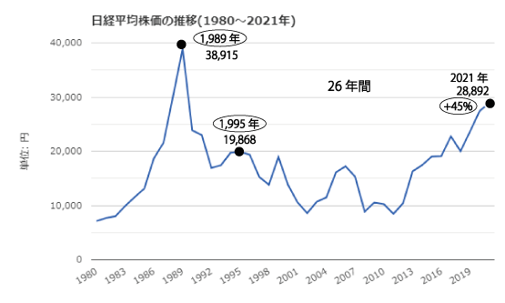 1995年から2021年を見ると、ダウ平均は600%で日経平均は45%📉
