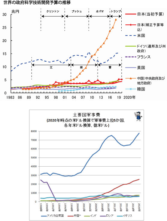 中国が2021年(約30兆円)まで急激に伸ばし、アメリカも15兆円までの高水準を保っていますが、日本は2‐3兆円で全く伸びていません。
