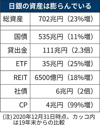日銀の2020年12月末現在の日銀総資産は、金融緩和によってGDP(約500兆円)の1.4倍にあたる702兆円に膨らんでいます。