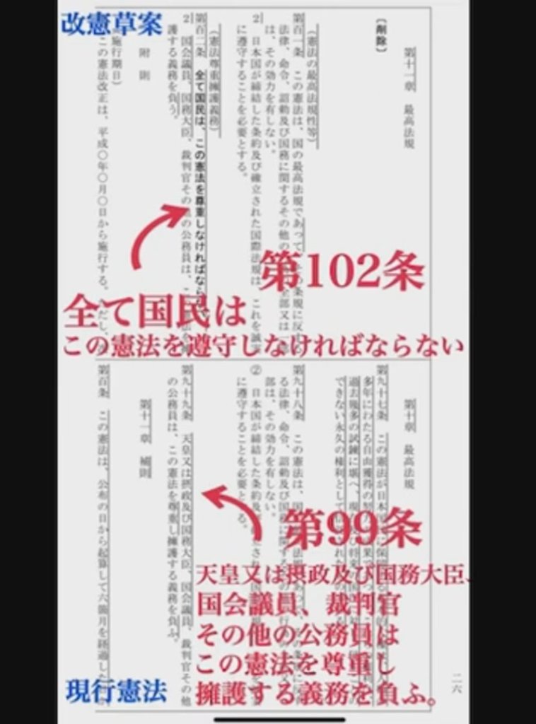 そもそも憲法は国家権力から国民の人権を守るために作られたもの。しかし、改憲案には「国家が遵守するもの」ではなく「国民が遵守するもの」に変えられています。